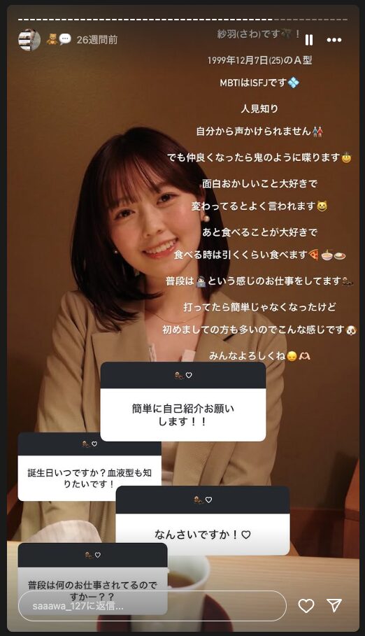 プロフィールについては紗羽さんご本人のInstagramからストーリーハイライトの質問で回答していました。
